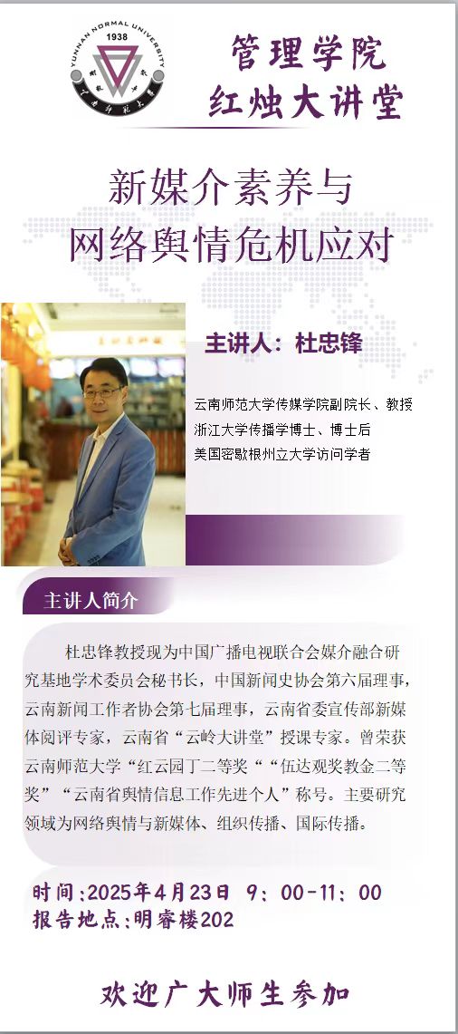 3044永利集团红烛大讲堂 即将迎来两场精彩讲座!从组织舆情的危机应对到人工智能的实践应用,两位学者将带来深度剖析和前沿洞见。无论你是学术研究者、行业从业者,还是对未来趋势充满好奇的学子,这里都有你不可错过的知识盛宴!