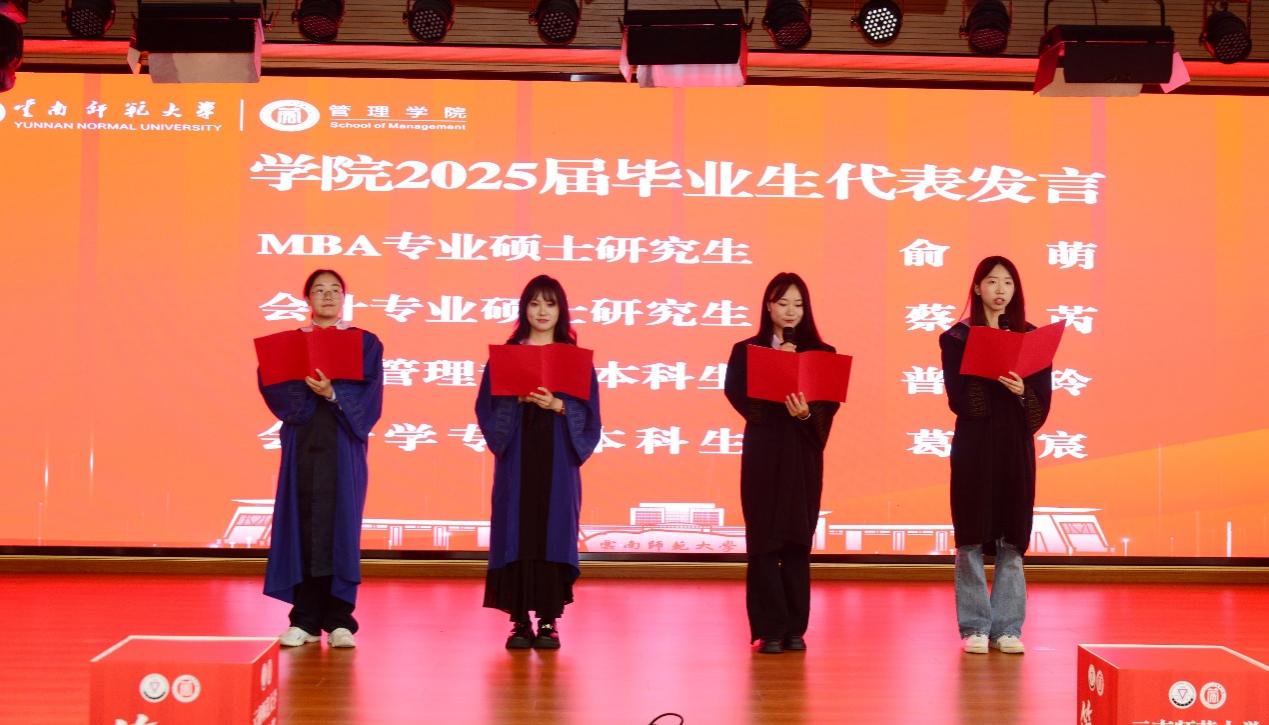李艳经理以“竹、烛、樱”为意象,赠予毕业生三声叮咛:“以竹为范,守心正立身直”,要求以诚信为节、责任为枝,让管理决策经得起良知叩问;“秉烛成星,聚微光映长夜”,呼吁在平凡岗位中汇聚人性温度,以共情力与协作精神点亮时代;“樱寄相思,携家国赴山海”,叮嘱毕业生常回望母校、倾听基层、创新开拓,永葆“眼中不灭的光,心中不冷的血”。