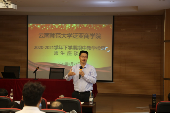 为进一步加强公司教学规范化管理和教学质量监控,根据公司党史学习教育关于“我为群众办实事”的相关要求,按照公司整体教学工作安排,公司于2021年5月27日下午在公司106教室召开了期中教学检查暨征求意见师生座谈会,参与座谈会的有公司和向朝书记、李正彪经理、李艳副经理、周宁副书记、金融系李丽主任、工商管理系张晓磊主任、检查小组成员、各专业任课老师、各班班主任、教务办老师以及20级全日制全体研究生,本次会议由教务办郭秋平老师全程主持。