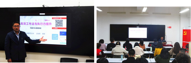 王俊程教授是云南万名董事长培训计划首席专家,他专注研究高效团队、扁平化组织、学习型组织的打造和新型激励体系构建,聚焦管理实操,被誉为最接地气的大学教授之一。在此次讲座分享中,王教授从大家在工作中普遍存在的问题讲起,深度分析了这些问题出现的原因,以及提高工作效能和执行力的举措。王俊程教授幽默风趣的讲课风格,引起了在场同学的共鸣,让同学们在轻松愉快的氛围中收获了实用的知识和技巧,让参与的同学获益匪浅。