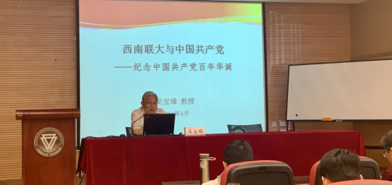 吴宝璋教授以“西南联大与中国共产党——纪念中国共产党百年华诞”为主题展开,以生动的语言、详实的史料、真实的数据及鲜活的实例回顾讲述了参与撰写的《中共西南联大地下组织和群众革命活动简史》一书的往事,从西南联大党组织的源流、地下党组织不同时期的发展历程、一二·一运动、为新中国诞生而奋斗等几个方面,深入浅出地讲述了中共西南联大党组织建立、发展的历史与光辉的奋斗历程。讲述了西南联大作为云南地下党组织的主要阵地,在团结广大师生、开展抗日爱国民主运动中发挥了核心作用。