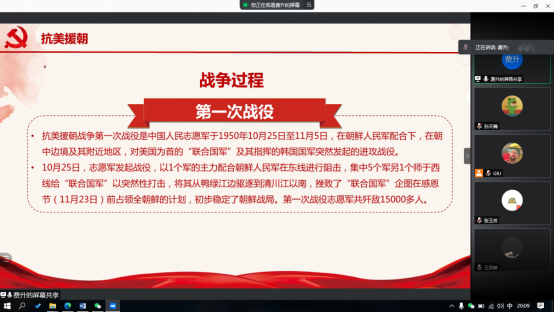 活动开始,支部党员费升同志带领大家开展了主题为“致敬抗美援朝·争做时代新人”的微党课学习。费升同志先向大家介绍了抗美援朝的历史,志愿军战士“英勇顽强、舍生忘死的革命英雄主义精神”让大家深受感动。接着,费升同志带领大家学习了习近平总书记在纪念中国人民志愿军抗美援朝出国作战70周年大会上的重要讲话精神,使全体支部党员同志更加深刻的了解抗美援朝的重要内涵和历史意义。